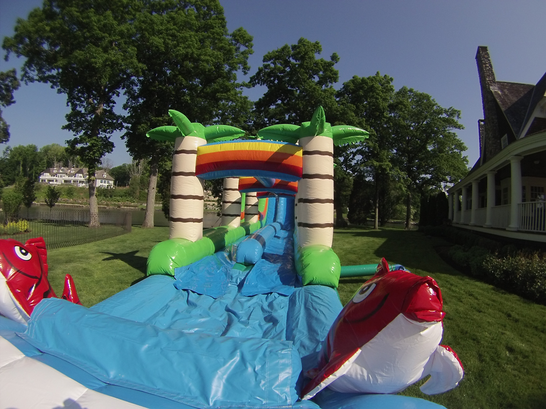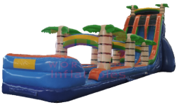 The Tropical Polynesian Plunge is as tall as we go. "The Plunge" is almost 3 stories tall!! This is a duel lane slide in which the rides slide through rainy palm trees into a large pool. This slide has been designed by us at New England Bounce About. There is nothing else like it.