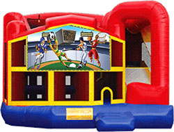 All Sports 5-1 Combination unit featuring slide, basketball hoop, obstacles and climbing.