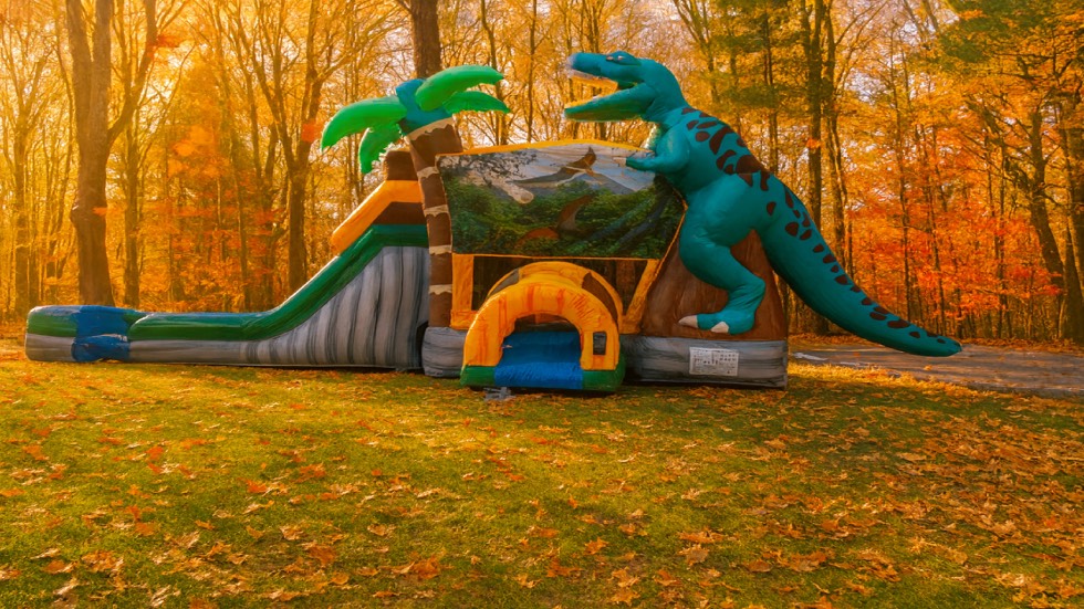 The kids bounced and slid down the double lanes with the palm trees swaying around them, trying to avoid the mighty jaws of the T-Rex. They even managed to score a few baskets on the basketball hoop, which was conveniently located inside the bounce area.