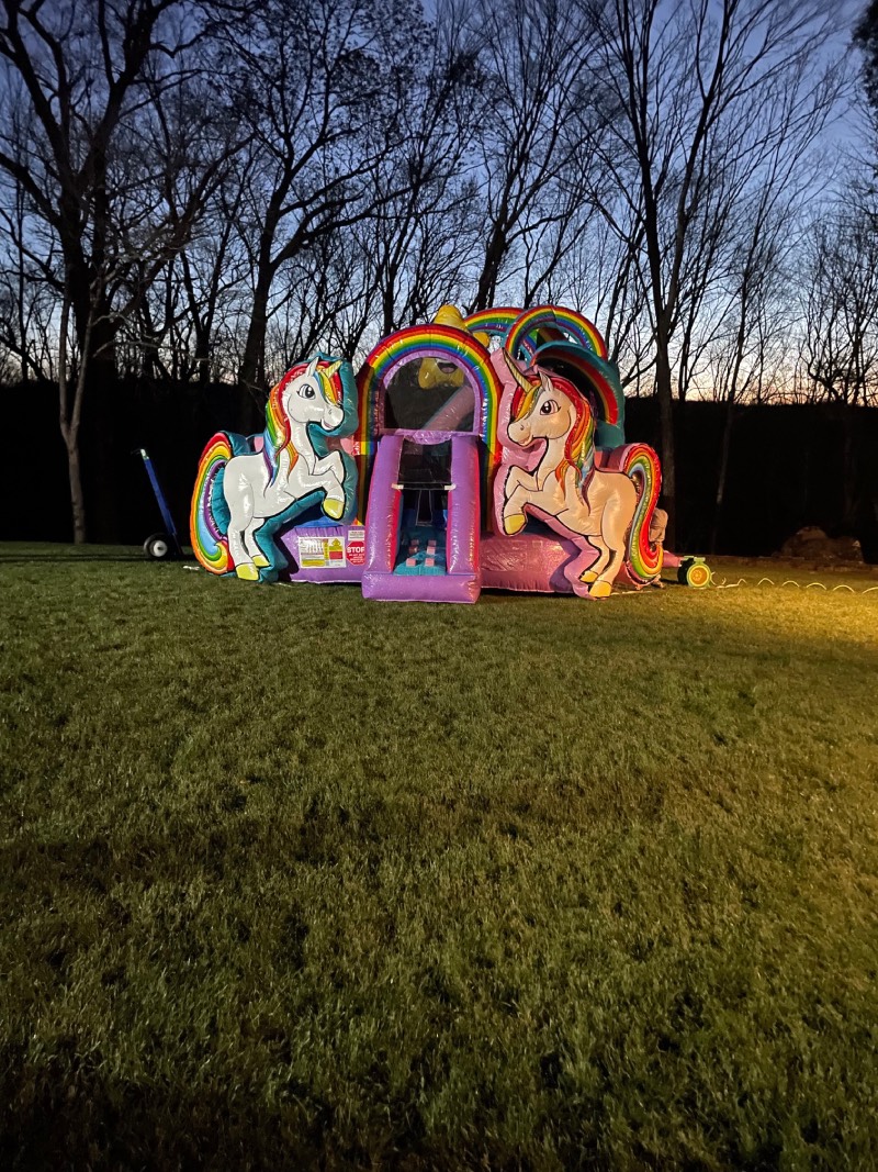 Introducing the enchanting Rainbow Unicorn Bounce House Slide Combination Unit, where dreams come alive and imagination knows no bounds! This magical inflatable is perfect for creating unforgettable memories at any children's party or event. With its captivating design, the Rainbow Unicorn Bounce House Slide Combination Unit features two towering rainbow unicorns in the front, welcoming little ones into a world of whimsy and adventure. As soon as they lay their eyes on these majestic creatures, their faces will light up with excitement. Crafted with utmost care and attention to detail, this bounce house slide unit offers a safe and exhilarating play experience. Constructed from high-quality materials, it guarantees durability and long-lasting fun for countless celebrations to come. The spacious bouncing area allows children to jump, leap, and frolic to their heart's content, surrounded by the vibrant colors of the rainbow. But the magic doesn't stop there! Climb up to the top of the slide and prepare for an exhilarating ride. As kids make their way down the thrilling slide, they'll feel like they're gliding through a rainbow. The combination of bouncing and sliding provides endless entertainment, keeping young adventurers engaged and active for hours on end. At New England Bounce About, we take pride in delivering the best inflatables for every occasion. With our Rainbow Unicorn Bounce House Slide Combination Unit, you can trust that your event will be nothing short of extraordinary. Whether it's a birthday party, a school carnival, or a community gathering, this inflatable will captivate the hearts and imaginations of children and adults alike. To book this enchanting attraction for your next celebration, contact us today at 203-364-0078 or email us at info@NEBA.party. Our dedicated team is ready to assist you in creating a magical experience that will leave everyone with memories to cherish. Don't miss out on the opportunity to bring the wonder of unicorns and rainbows to your event! Dimensions: Height 14' 00" | Width 18' 6" | Length 16'